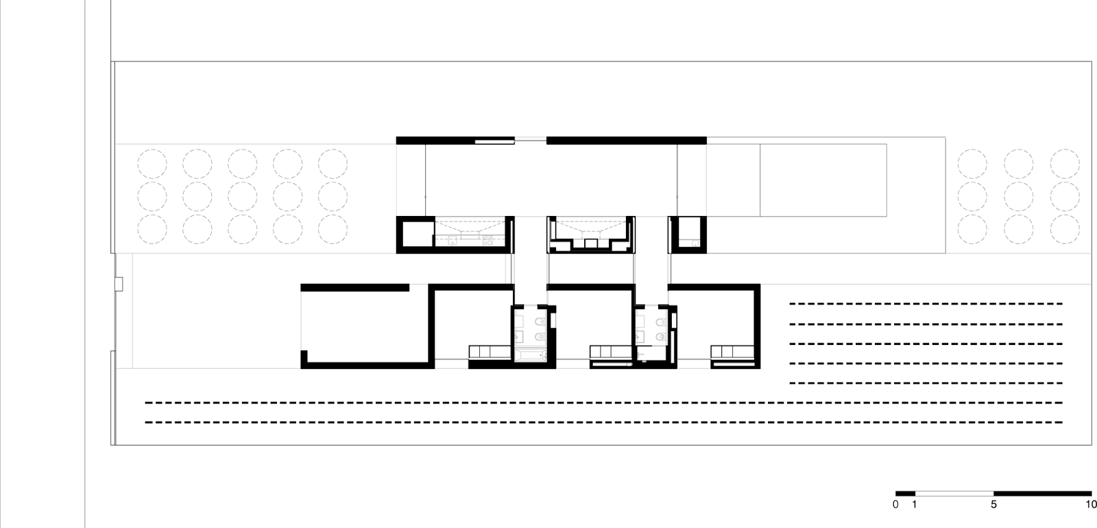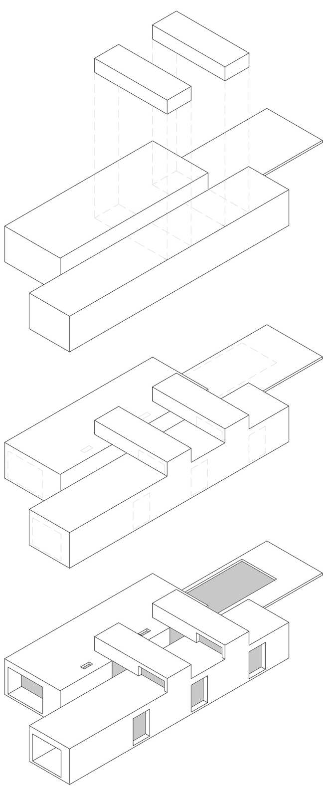 O projeto é composto por dois volumes longitudinais que são posicionados no lote como dois containers programáticos: o primeiro dele, ocupado pelas áreas de estar (lounge, sala de jantar e cozinha) onde há uma transparência maior ao exterior e à paisagem do entorno. No segundo volume estão os quartos, banheiros e a garagem. Entre esses dois volumes tem um ritmo de espaços externos e internos ocupados pela entrada, circulações e pátio. Esses espaços criam diferentes tipos de ambiência ao longo do dia devido aos diferentes tipos de insolação e também à possibilidade de tranparência entre esses volumes. A organização racional desses volumes permite visões distintas de diferentes profundidades que atravessam a casa em diferentes direções. Por outro lado, os quartos, um espaço mais fechado e íntimo e estão voltados para o leste, com vista para as videiras. Dois volumes transversais estão posicionados no topo da casa, compostos por duas chaminés e permitem a iluminação dos banheiros e áreas de distribuição. A cozinha e a lareira, ambas adjacentes à sala de estar, são esculpidas nas paredes e iluminadas por duas janelas de teto que lembram as lareiras da arquitetura tradicional da região.
